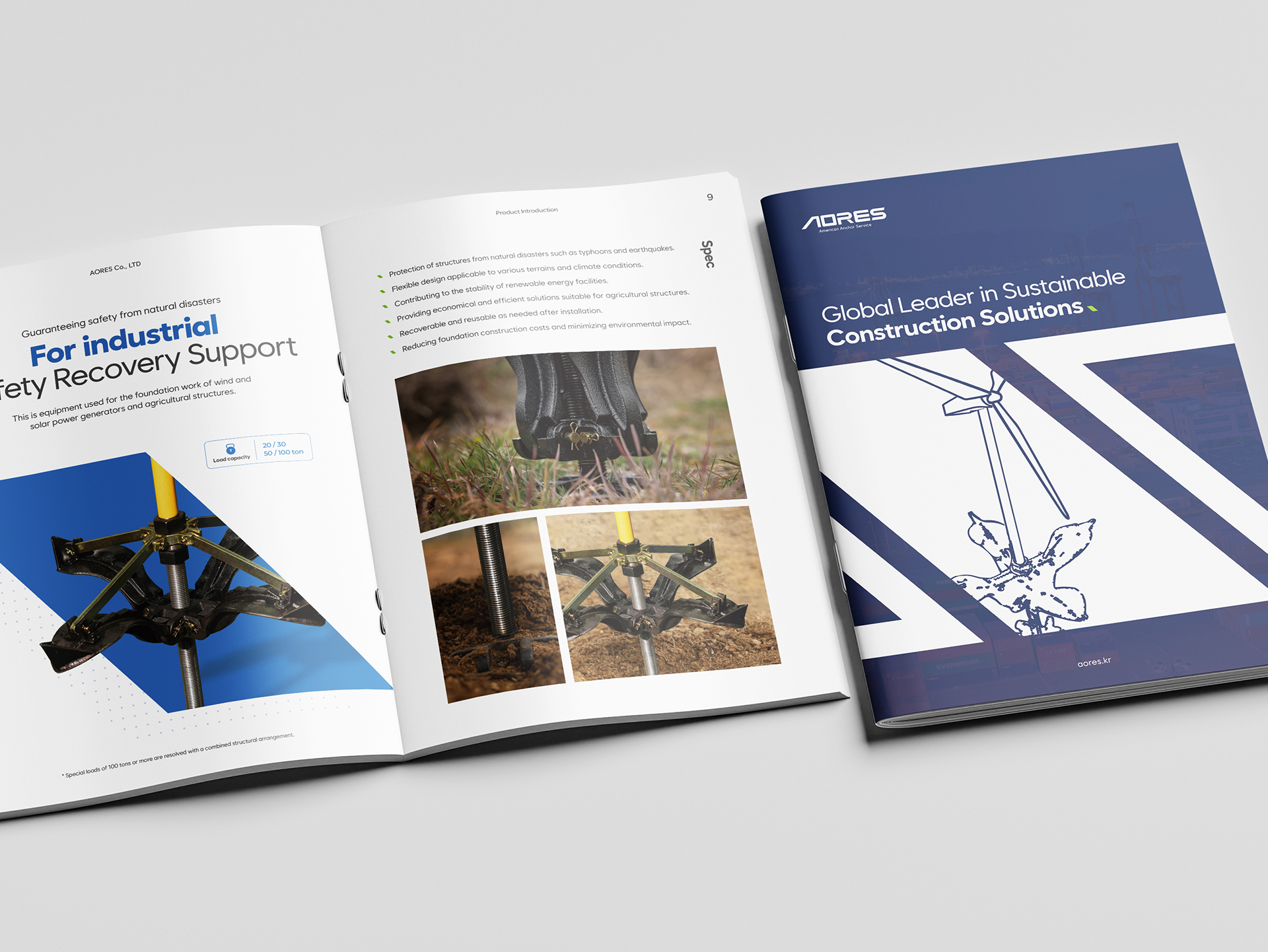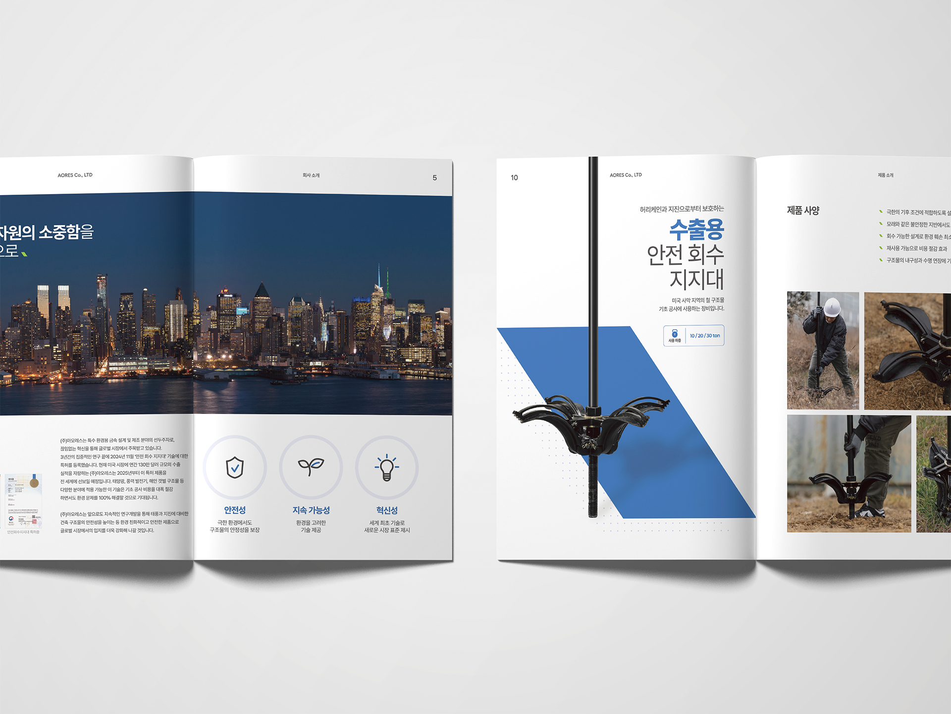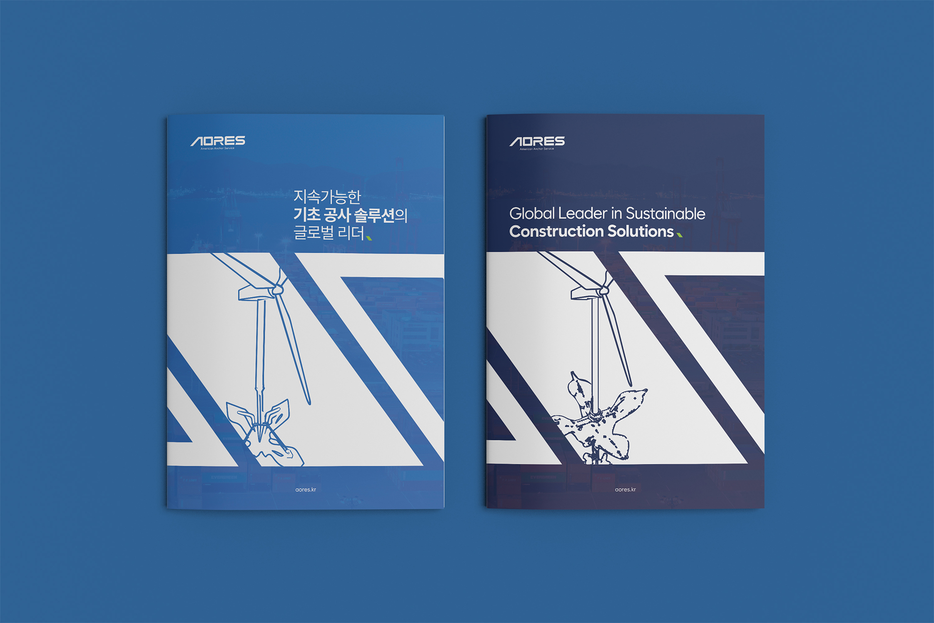 기하학적이고 미래지향적인 서체는 기술 기업으로서의 전문성을 강조하여, ‘R’에 적용된 블루 포인트는 심볼과의 시각적 연결성을 만들어내며 안전회수 지지대의 혁신적인 구조를 상징합니다. 이러한 디자인 요소들의 조화는 아오레스가 추구하는 안전성, 혁신성, 지속가능성의 가치를 현대적이고 세련된 방식으로 전달하여 글로벌 기업으로서의 미래 비전을 함축적으로 보여줍니다.