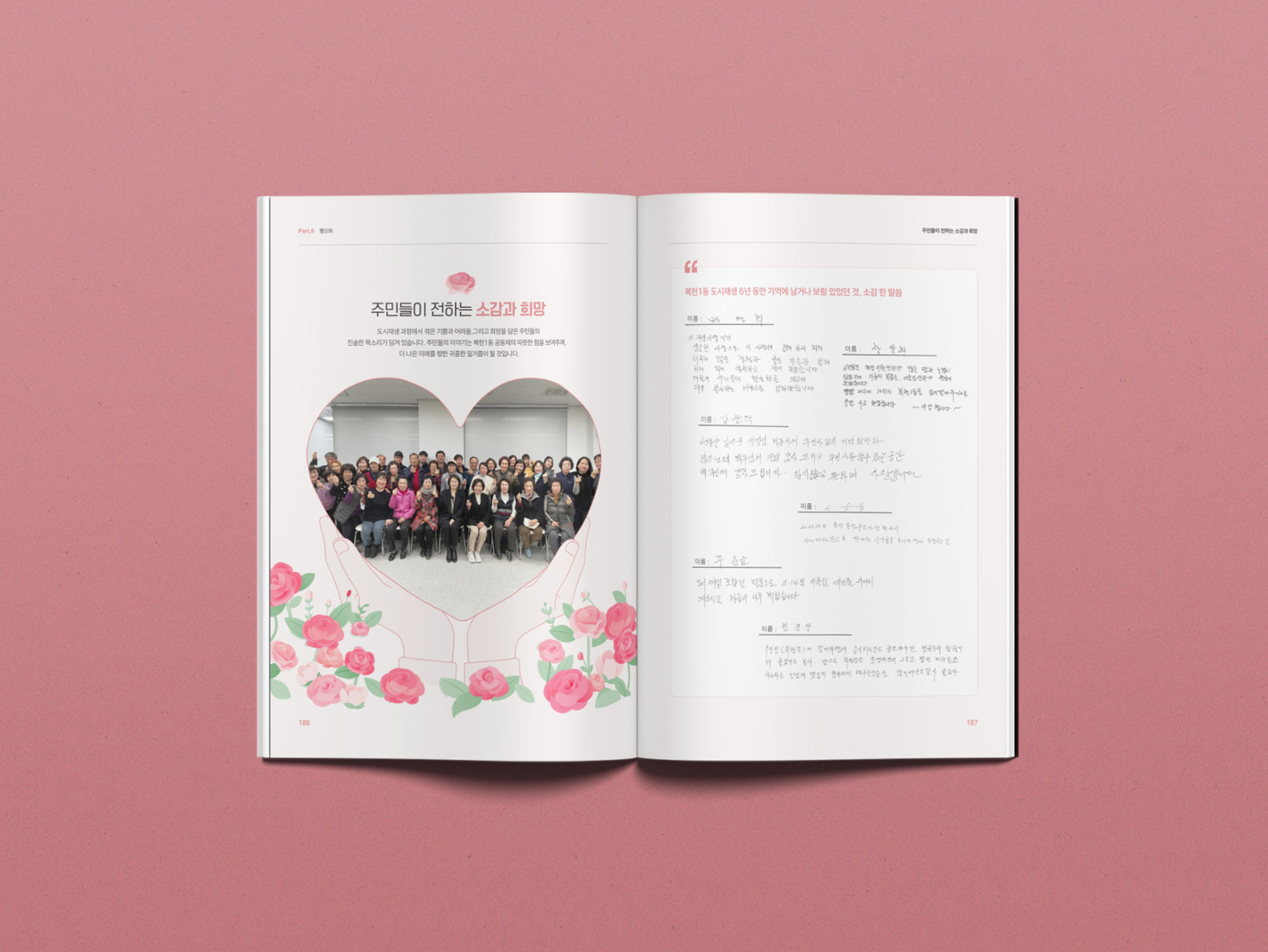 복현마을의 과거와 현재를 동시에 들여다보며, 그 위에 새롭게 피어난 장미로 마을의 재생과 희망을 상징합니다. 장미의 선은 사람들의 이야기가 얽혀 새로운 공동체를 만든 흔적이자, 미래로 이어질 복현의 시간을 담아냅니다